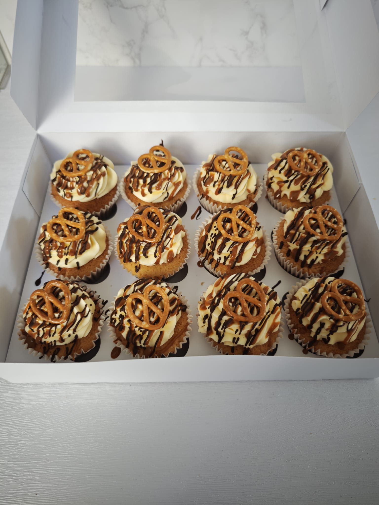 A brown sugar vanilla sponge with a caramel buttercream, drizzled with salted caramel and topped with a salted pretzel