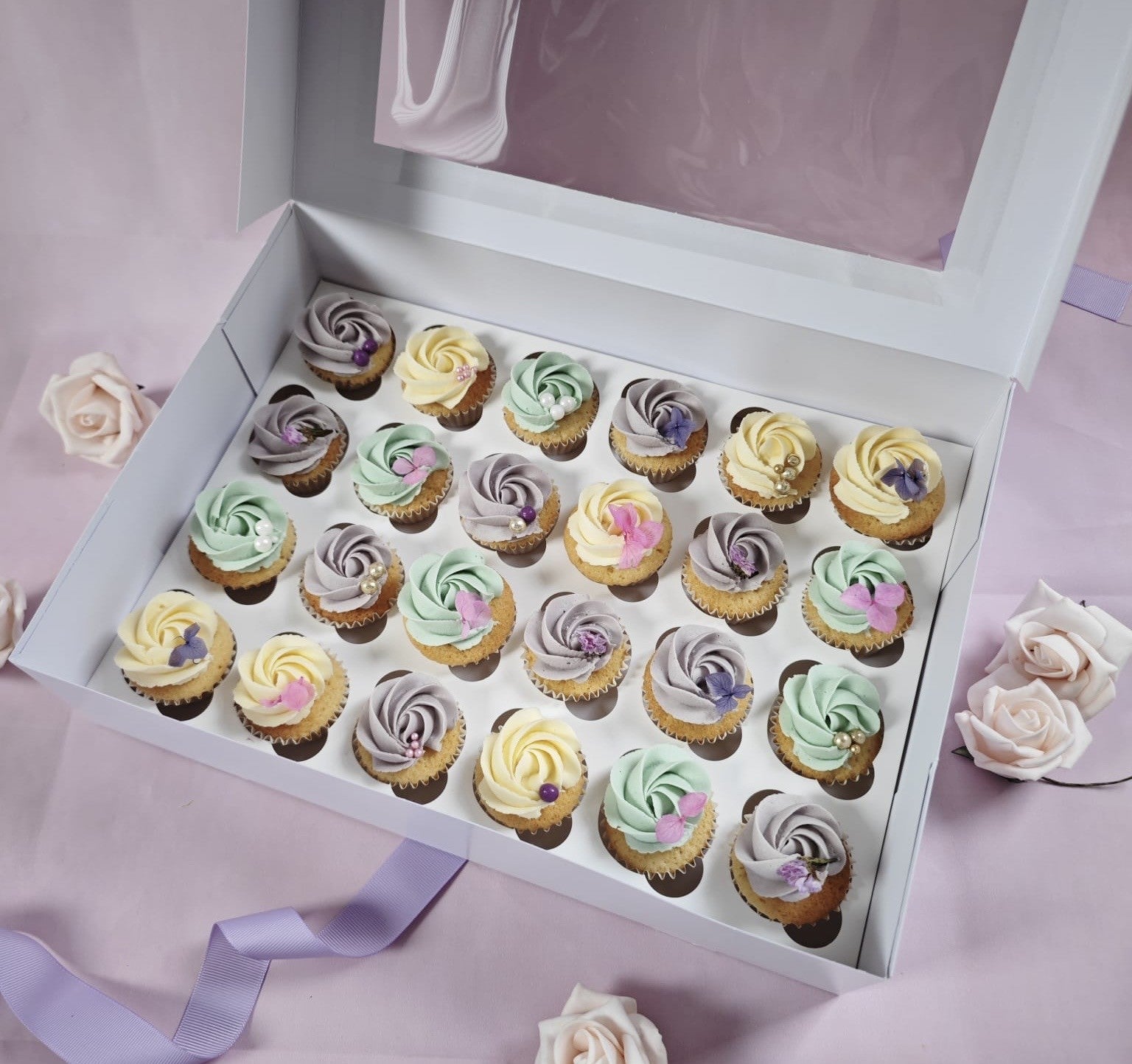 Bite sized cupcakes available in vanilla or chocolate sponge, adorned with edible decorations.