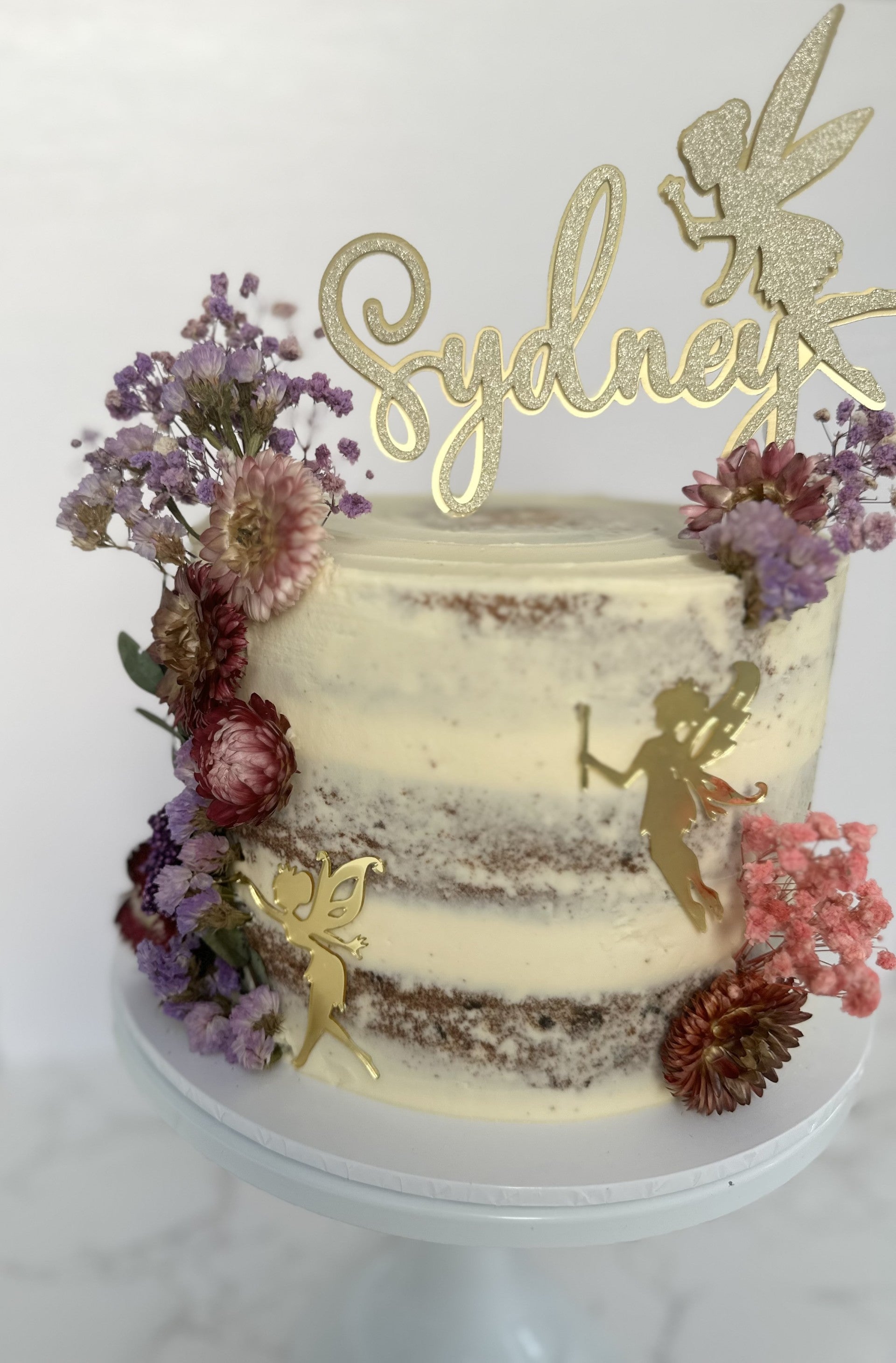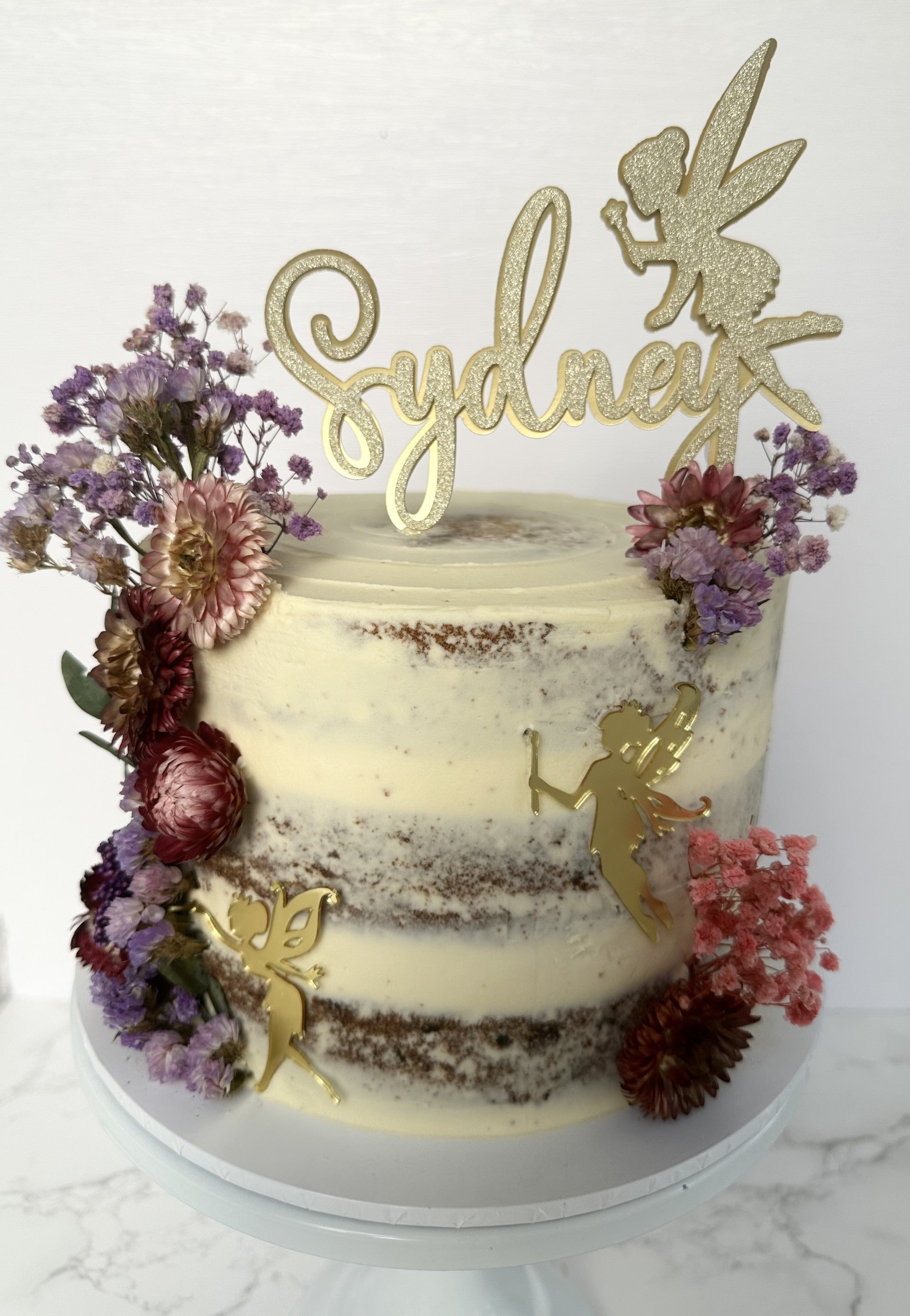 3 layers of sponge filled with filling of your choice. Topped with dried flowers and gold fairies